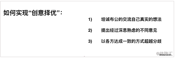 第一,你必须要让大家的真实想法,都能够提出来放在桌面上,大家一起来讨论。通常情况下人们不会这么做,大家不愿意把自己的想法,一开始就放到桌面上。但要实现“创意择优”,首先就要把真实的想法提出来。