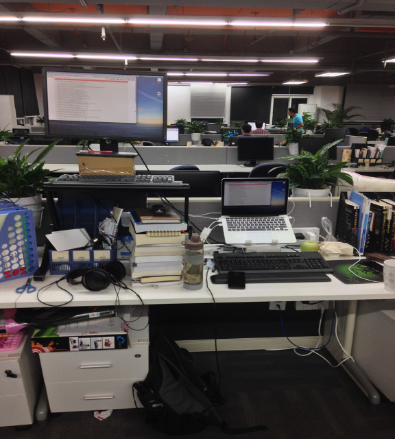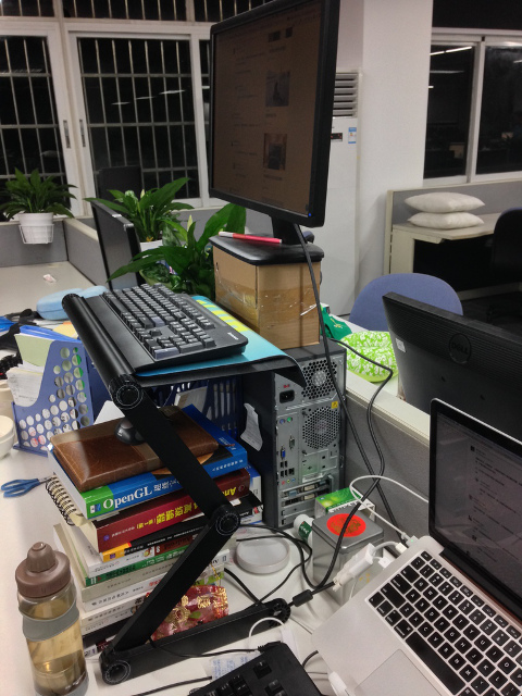 最早看到我们部门站立办公的是龙哥和谢杨,那个时候我们还在网易大厦,谢杨拿了张凳子放在桌面上,然后把Macbook Air放在凳子上站立编程。不过现在谢杨已经毕业去创业了。