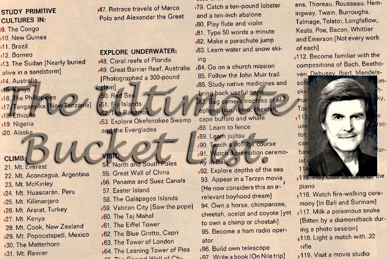 之所以要开出那张清单,是因为15岁时,我很明白自己的局限性。我只是一个拥有潜能的孩子(而这种禀性人人都具有),我确实想在自己的一生中做这些事情。我对什么都极感兴趣——旅行、医学、音乐、文学、自然,所有这些事情我都真想做。我制定了欲达目标的一份蓝图,以使自己永远有所追求。
